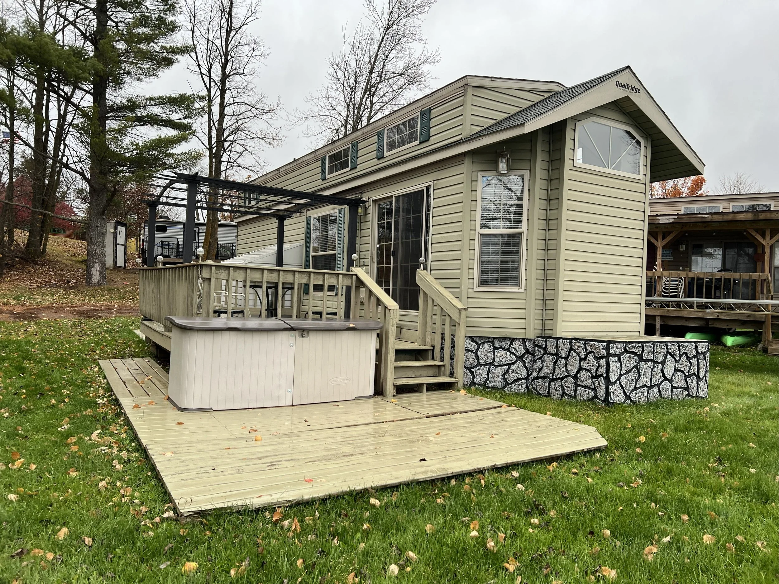 This park model is a cozy park model. As you walk through the patio door you enter the front living room. The front living room has a sofa sleeper and glider rocker with foot stool that faces the entertainment center/hutch. As you go towards the rear of the park model, there is a table with 4 chairs and the kitchen on the left. The kitchen has a microwave, residential size refrigerator and range. Around the corner on the right side is the residential bath. In the rear of the park model is a queen size bed with closet, chest of drawers and TV shelf. Above the kitchen and bath room is a loft that has plenty of room for the kids or grandkids! This park model has ducted AC and a ducted furnace. There is also two ceiling fans. There is a deck and hard awning to sit out on and under while you enjoy the "lake life". Screen has been added for more privacy. There is a metal shed and plastic shed/bin included for all your storage needs.
